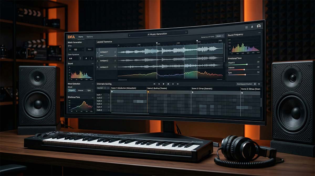 Within the AI Filmmaking module, students explore AI-driven music generation for background scoring, ambient layering, and mood development. The focus remains on narrative alignment, tempo control, and emotional consistency, ensuring generated tracks support cinematic storytelling rather than overpower it.