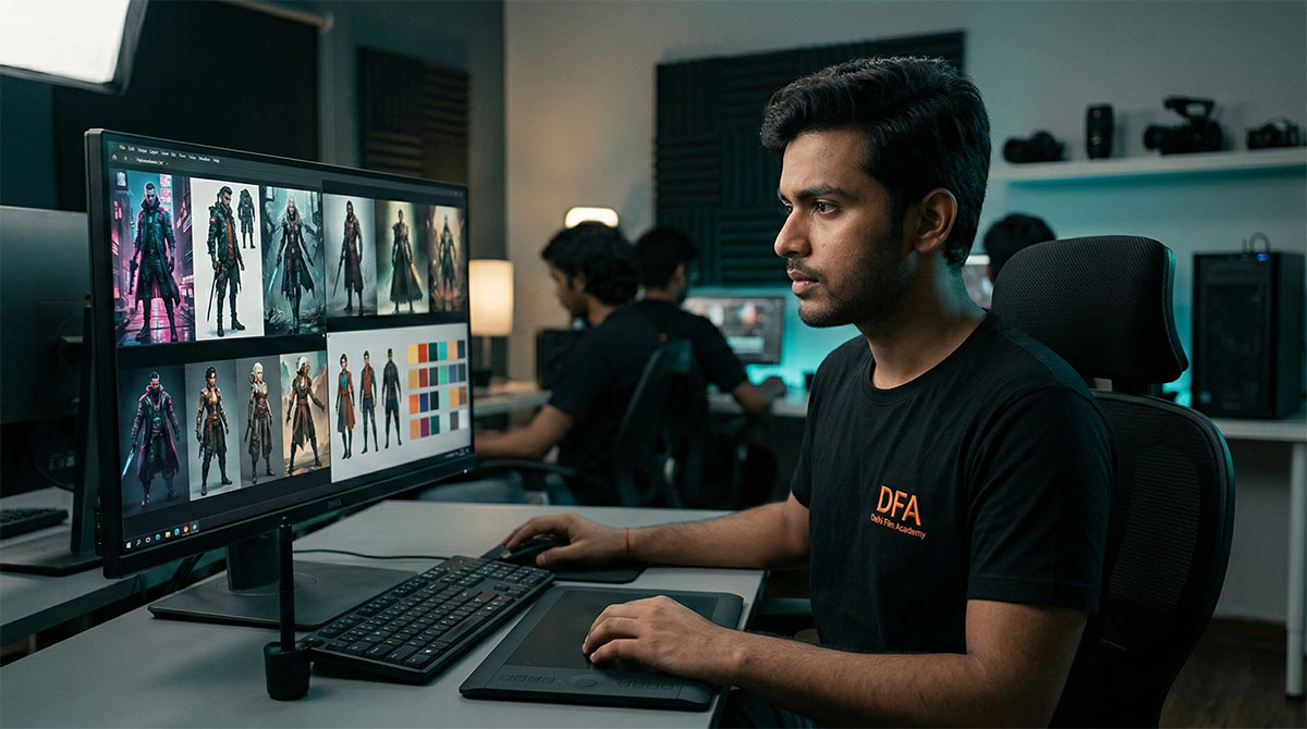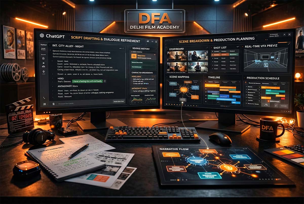 Film Direction at Delhi Film Academy focuses on real-world directing through practical filmmaking and web-series production. Students learn how to translate a script into screen reality by working closely with actors, cinematographers, and production teams on live sets and funded projects.
