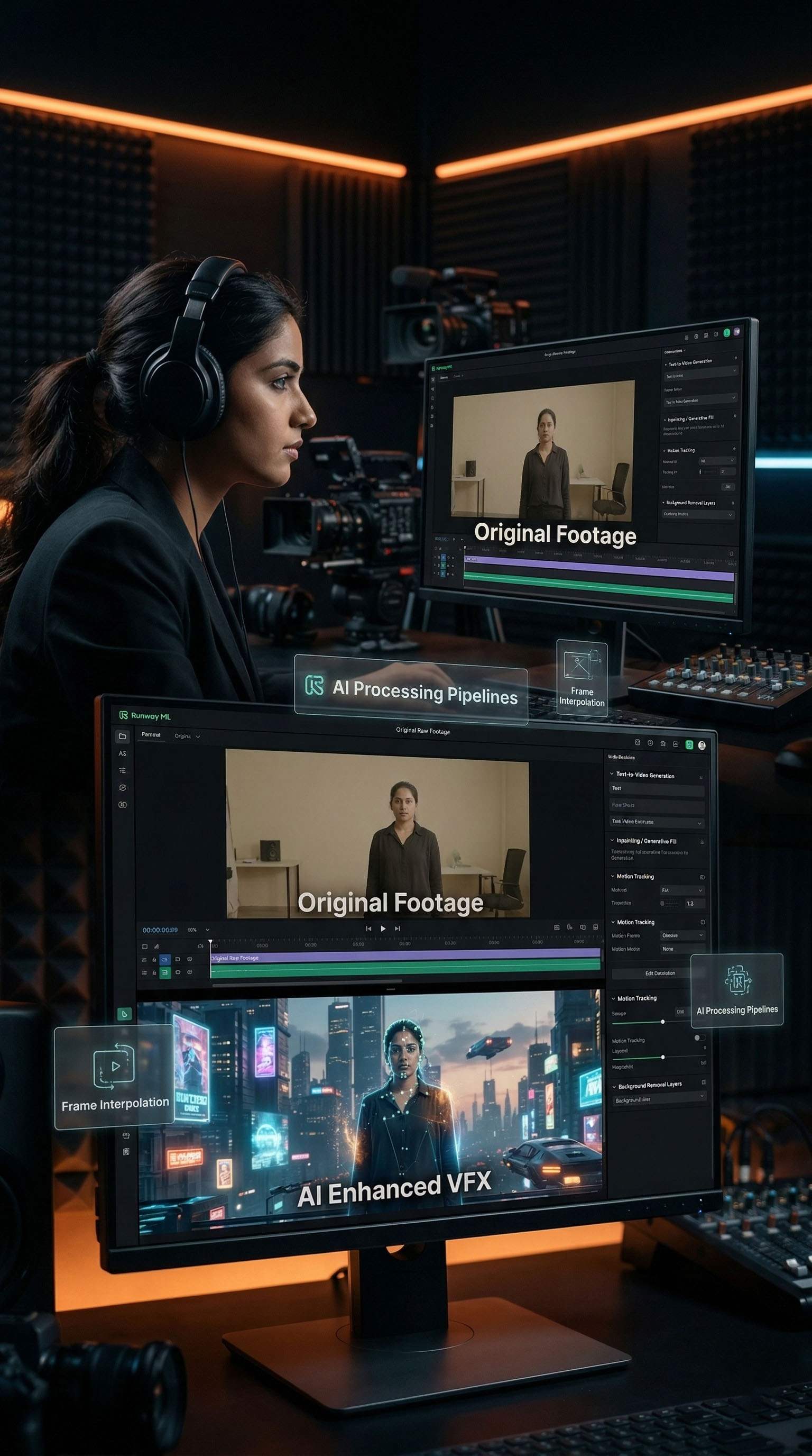 Composition: AI-assisted filmmaking strengthens visual composition through intelligent framing suggestions, digital scene extensions, and enhancement tools. Students understand how to preserve professional cinematography principles while integrating AI-generated visual layers seamlessly.