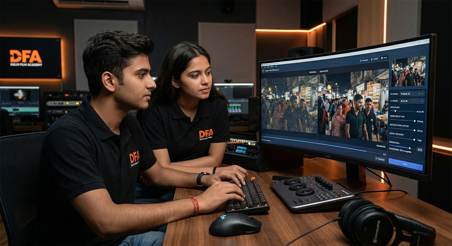 Through guided workflows, students understand how to enhance resolution, restore clarity, and optimize frame quality without introducing artifacts or distortion. The emphasis remains on preserving cinematic integrity while using AI-driven enhancement tools to meet broadcast and OTT delivery standards.