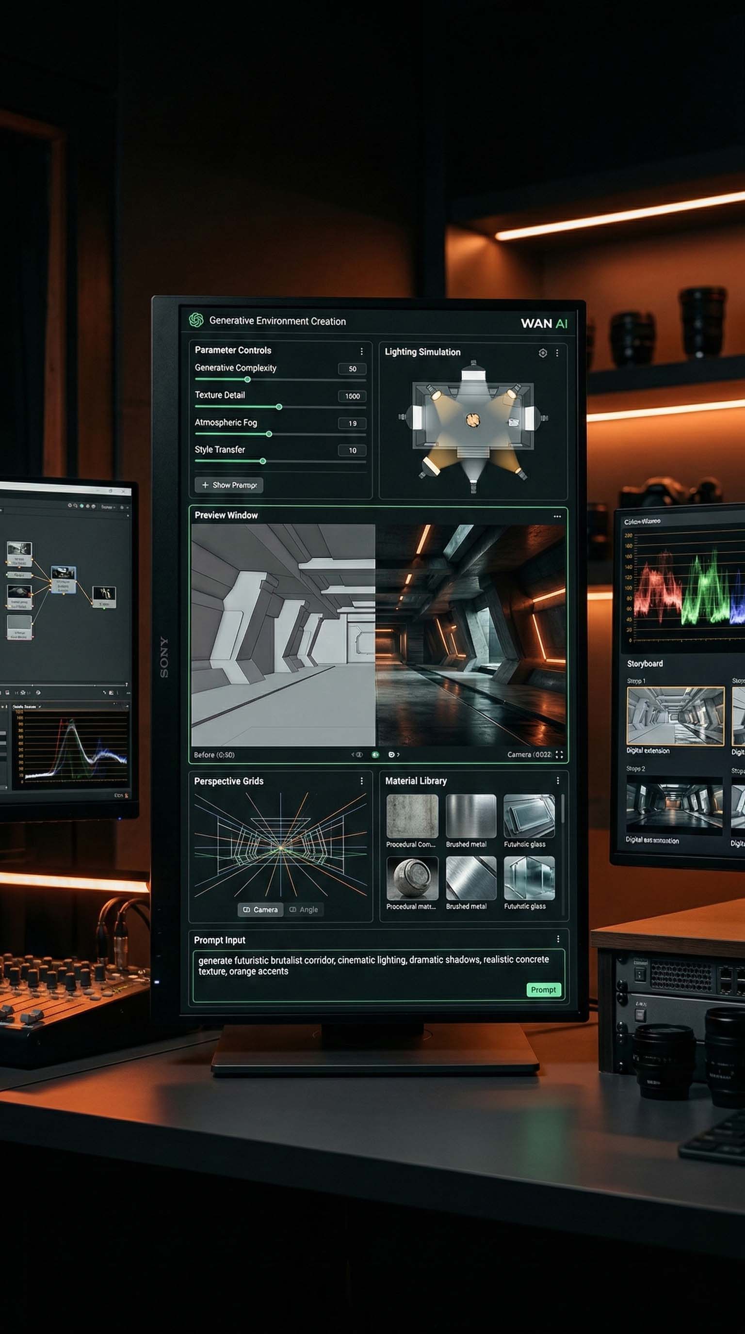 MidJourney is used for high-detail concept visualization including environments, production design references, and tonal mood development. Students practice structured prompting and lighting logic to generate pre-visual assets aligned with cinematic framing standards.